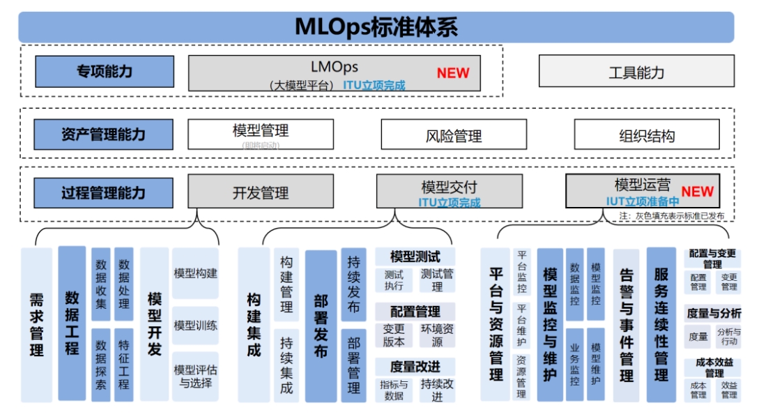 为进一步推动行业达成共识、树立基准和标杆,中国信通院已完成MLOps能力成熟度模型(开发管理、模型交付、模型运营)过程标准编制,覆盖了MLOps全过程能力域,正式发布《人工智能研发运营一体化能力成熟度模型》系列标准(以下简称《标准》)。