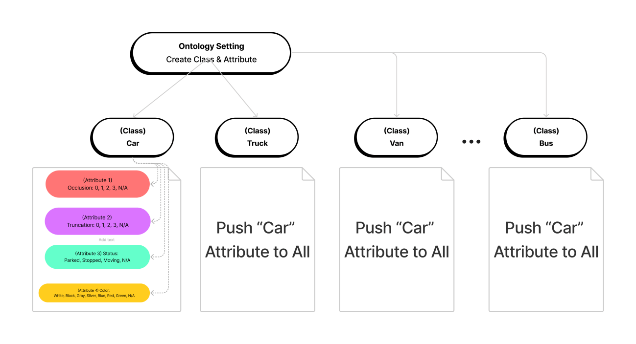 当我们的数据集众多时,每个数据集中的实体的命名经常出现不一致的情况,但是它们中有些确实在表达相同或是近似的含义。例如在数据相对复杂的自动驾驶场景中,常见的“卡车”标签会被命名为“Truck”,但有的数据集会细分为“Pickup_Truck”,“Semi-Truck”, “Garbage_Truck”等。在通过“Truck”的名字来搜寻跨数据集的实体和结果时,很容易丢失掉已有的数据。再举一个简单的例子,“dog”和“cat”的实体,在数据集里可能只需要以“Animal”的标签而归为一类。