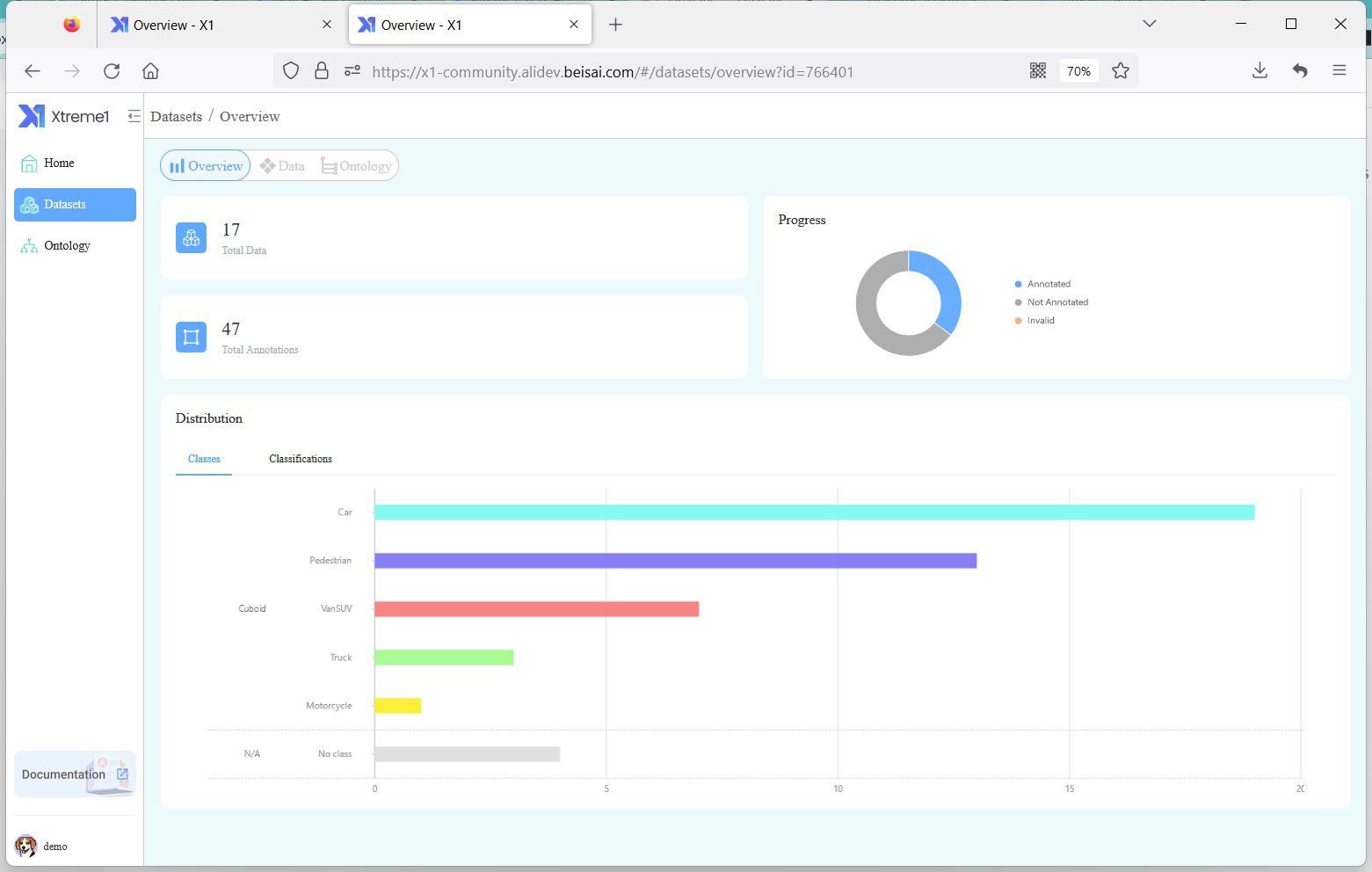 通过图表,统计数据集标注的完成状态和标签的数量。