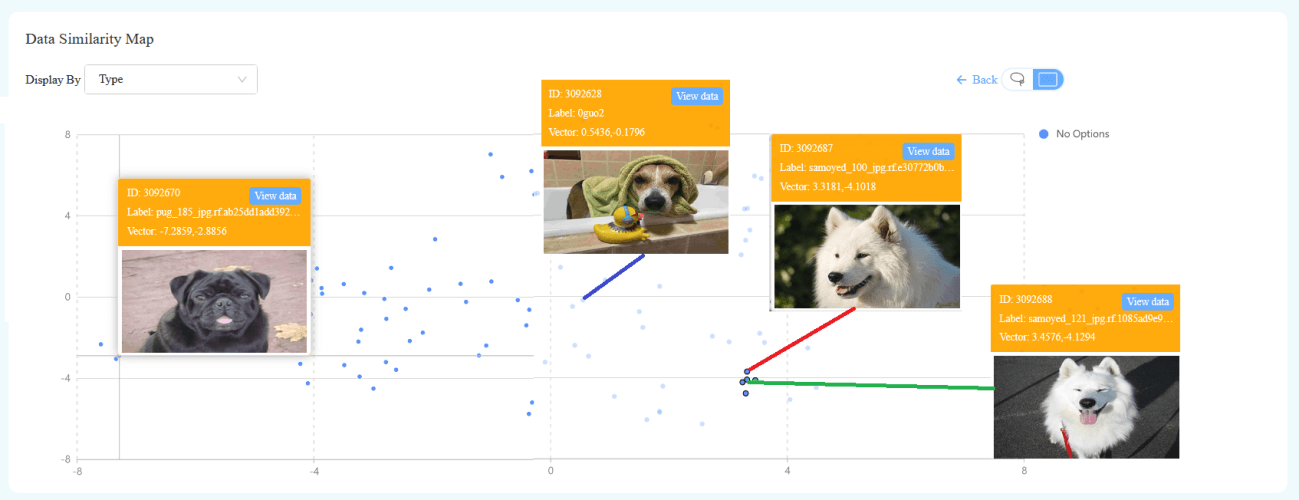 在一个区域中,距离很近的点说明附近图片相似度很高。如果很稀疏,则表明此类的数据数量有缺失,如果模型的效果不佳,可以通过再增加采集这类的数据的数量,继续进行数据的标注并灌入模型中。这样通过丰富数据来提高模型的表现。